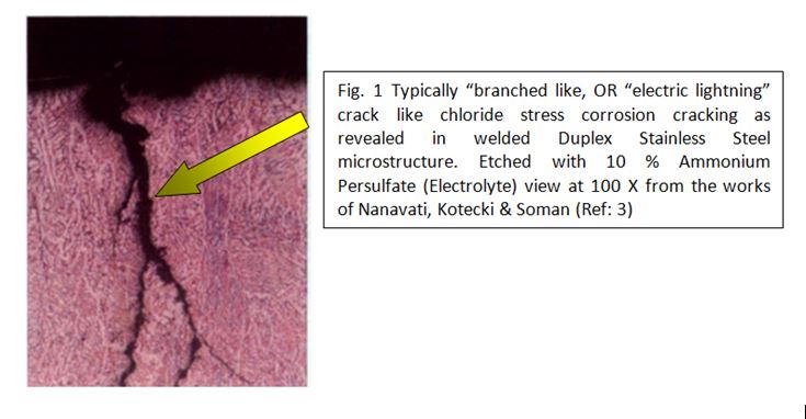 They often failed due to chloride stress corrosion cracking as revealed by microstructure bearing typically “branched like, OR “electric lightning” crack (Ref 1-3). The combination of high temperature, high chloride content and the cold worked plate Type 316 material, becomes highly susceptible to Chloride Stress Corrosion Cracking (CSCC) leading to failure. However, as with many materials, the duplex stainless steels may be susceptible to stress corrosion cracking under high temperature, chloride-containing environments, or when conditions support hydrogen-induced cracking (HIC) as shown in Fig. 1 (Ref: 3)