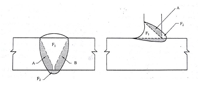 Schematic for estimating dilution by two base metal A & B, when welded with Filler F