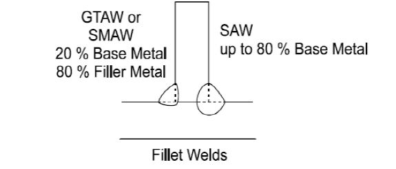 As can be seen in figures below, usually with SMAW, GMAW & GTAW processes, 15-20% of the contribution from base metal (i.e total 20 -40 %, from each side of the joint) is expected. While in SAW process, due to its high arc efficiency as much as 80% contribution from base metal is expected.