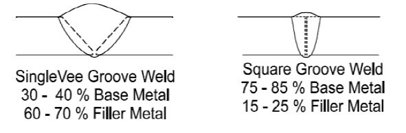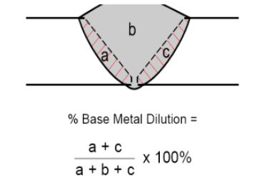% Dilution = (X / X + Y) X100, Where X= amount of Base Metal Melted. Y= Sum of Base metal + Filler added