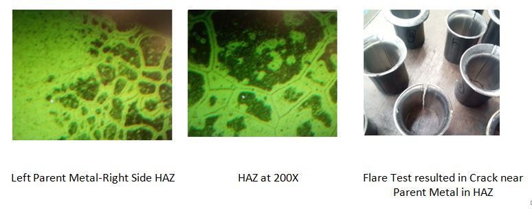But the Product failed under the “Flare test” (According to ASTM A370-10 Mechanical Testing of Steel Products – Tube Flattening and flaring is performed with a tapered mandrel, which is inserted into the sample to expand by a 60°angle the mouth of the flare in which the adjacent length of the angle shall follow specification. The expansion of the inside and outside diameter is also dependent on standard specifications. After the test, the samples must not have any visible cracks