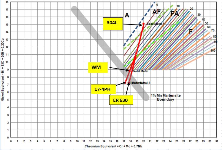 When composition of the base metal 17-4PH Steel, SS 304L and filler metal ER 630 plotted on the WRC 1992 diagram indicates, it can be seen that 17-4PH and matching filler metal ER 630 being martensitic, their composition falls on 1% Mn martensitic Boundary while other base metal SS 304L being austenitic , its composition located on the top right inclined to approximately, 2 FN near AF boundary. Considering equal 15%-15% contribution from each base metals, i.e. total 30% dilution of filler metal , the weld metal composition is lying on martensitic boundary, which is not rather safe weld metal composition due to very poor weld metal ductility. Such weld metal have difficulty passing bend test. Besides this, such weld metal composition, depending on dilution of base metal into filler metal composition, may contain at least 15-20 FN , and rest of martensite which , during high ageing temperature may cause embrittlement in weldments by transformation of sigma phase from ferrite phase.