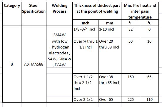 Preheat and interpass temperature requirements are based on the thickness of the base metal and follow those of Group II steels under AWS D1.1. The preheat requirements for A588 weathering steel, which is a Category B steel, are as follows: