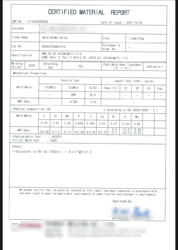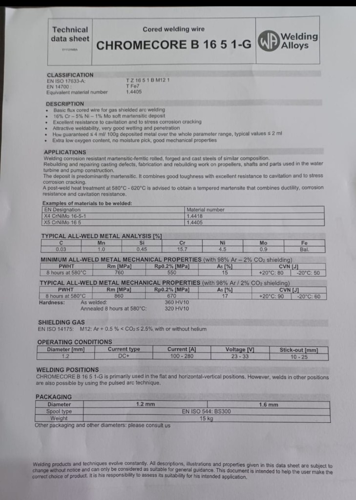 After having studied the product literature for consumable specification E410Ni Mo cored Wire classified under AWS A 5.22 classification & Material data sheet for consumable specification Chrome Core B 16 5 1 G classified under EN/ISO 17633-A.